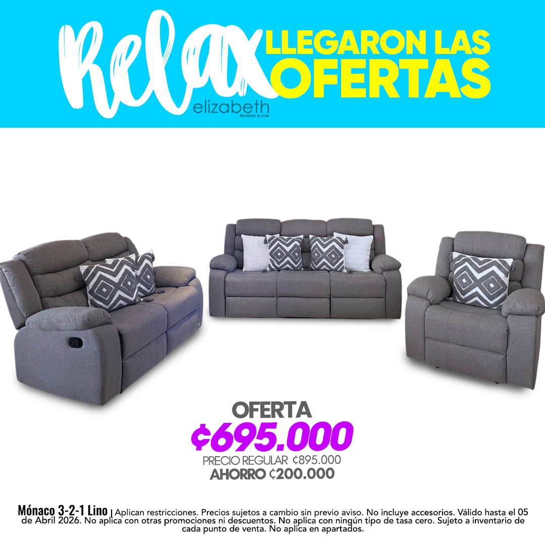 Mónaco 3-2-1 Lino | Aplican restricciones. Precios sujetos a cambio sin previo aviso. No incluye accesorios. Válido hasta el 05 de Abril 2026. No aplica con otras promociones ni descuentos. No aplica con ningún tipo de tasa cero. Sujeto a inventario de cada punto de venta. No aplica en apartados.